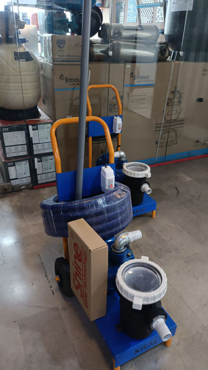 کارکرد این نوع جارو شباهت زیادی به جاروبرقی منزل دارد و از یک موتور الکتریکی مکنده، لوله خرطومی، لوله تلسکوپی و سری جارو تشکیل شده است. موتور الکتریکی همان پمپ استخر است که با قرار گرفتن لوله یا شلنگ در آب، مکش را شروع میکند. قبل از آن باید سپس بر سر لوله تلسکوپی یک اسکیمر نصب کنید. با روشن کردن موتور، اسکیمر به کف یا دیواره استخر میچسبد. اپراتور جارو باید با حرکت دادن لوله تلسکوپی همهجای استخر را جارو کند. بنابراین جاروی دستی استخر نیاز به نیروی انسانی دارد. جاروی شارژی استخر نیز ابعاد کمتر و طراحی جمعوجورتری دارد که استفاده از آن بسیار آسان است.